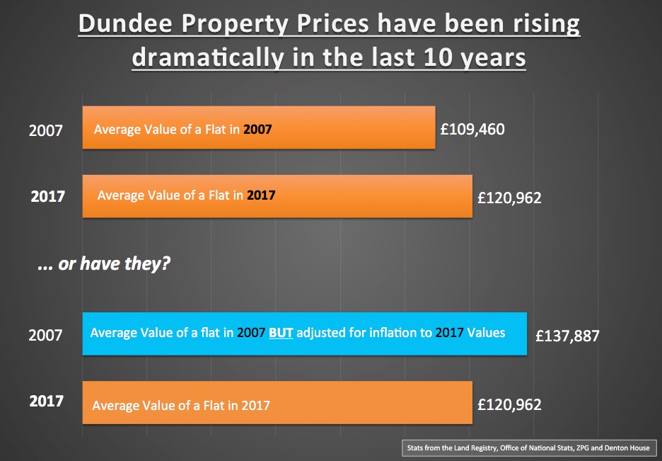 However, between 2007 and today, we have experienced inflation (as measured by the Government’s Consumer Price Index) of 25.97% meaning that in real spending power terms Dundee apartments are 15.5% more affordable than in 2007. Looking at it another way, if the average Dundee apartment (valued at £109,460 in 2007) had risen by 25.97% inflation over those 10 years, today it would be worth £137,887 (instead of the current £120,962).
