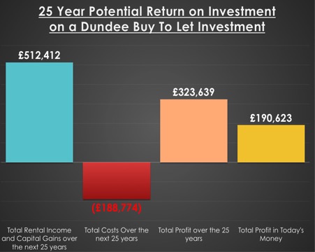 A typical Dundee landlord receives, on average, rent of £10,200 per annum per terraced/town house property and so, over a 25-year period, that example property would generate a total rental income of £389,895 (again – very conservatively assuming a compound annual growth rate in the rent of 1.71% per annum).