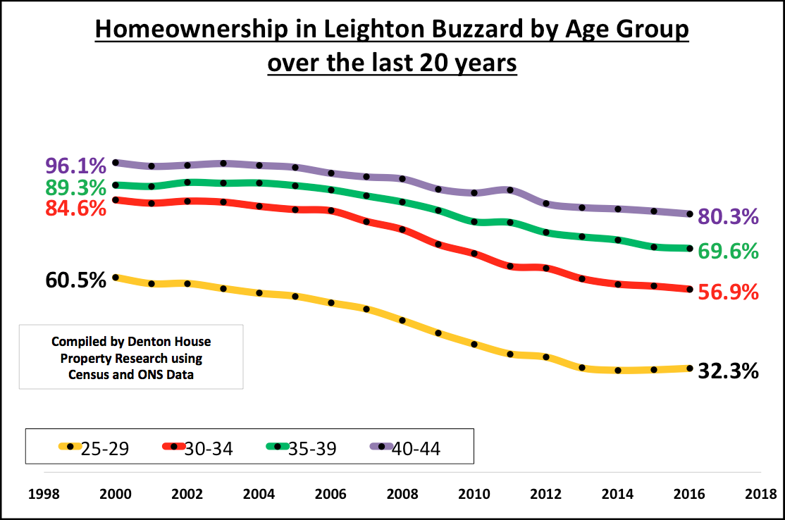 If you look at the graph below, split into the four age ranges of 25 year olds (yo) to 29yo, 30yo to 34yo, 35yo to 39yo and finally 40yo to 44 yo, you will quite clearly see the changes since the Millennium in Leighton Buzzard. The fact is the figures in Leighton Buzzard show the homeownership rate has proportionally fallen the most for the youngest (25yo to 29yo) age range compared to the other age ranges.