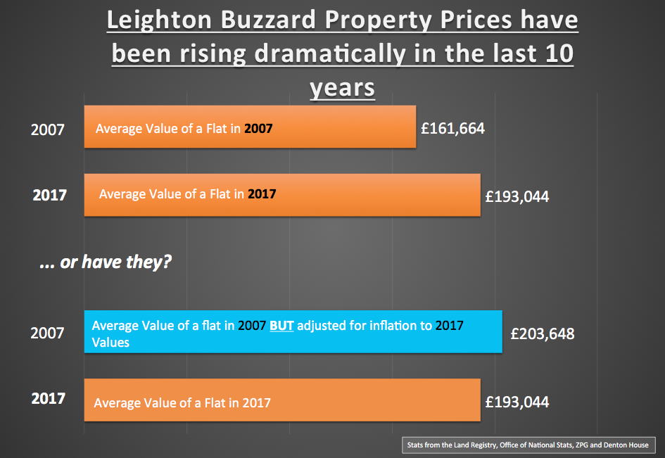 However, between 2007 and today, we have experienced inflation (as measured by the Government’s Consumer Price Index) of 25.97% meaning that in real spending power terms Leighton Buzzard apartments are 6.6% more affordable than in 2007. Looking at it another way, if the average Leighton Buzzard apartment (valued at £161,664 in 2007) had risen by 25.97% inflation over those 10 years, today it would be worth £203,648 (instead of the current £193,044).
