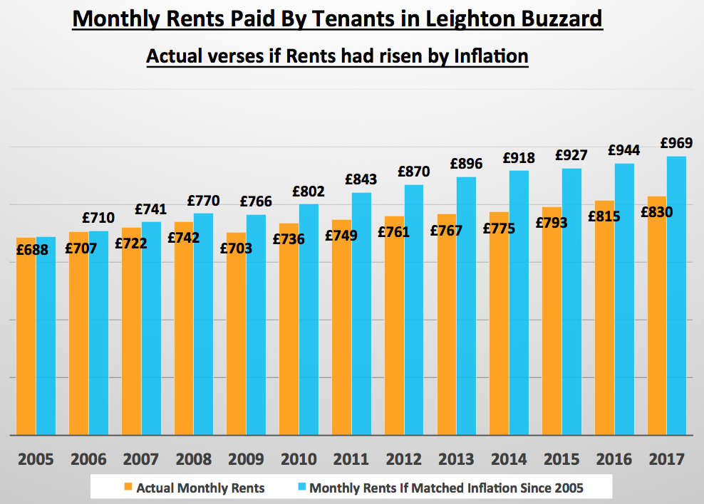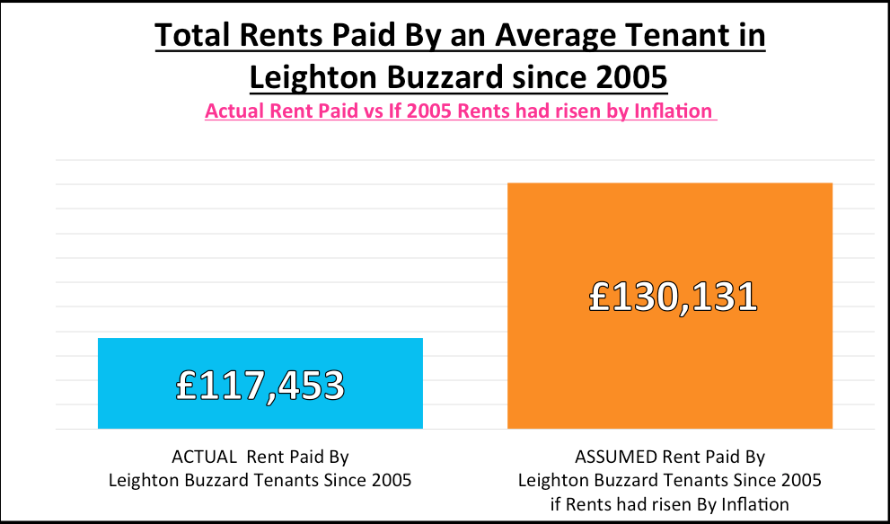 Looking at the chart above, the average rent of a Leighton Buzzard property in 2005 was £688 per month (pm)  … if it had risen by inflation, today, that would be £969 pm. As I have already mentioned in the article, today it only stands at £830 per month. Looking over the last 12 years, adding up all the differences between what the average actual rent was compared to what it should have been if rent had gone up by inflation, the average Leighton Buzzard Millennial tenant would have paid £130,131.