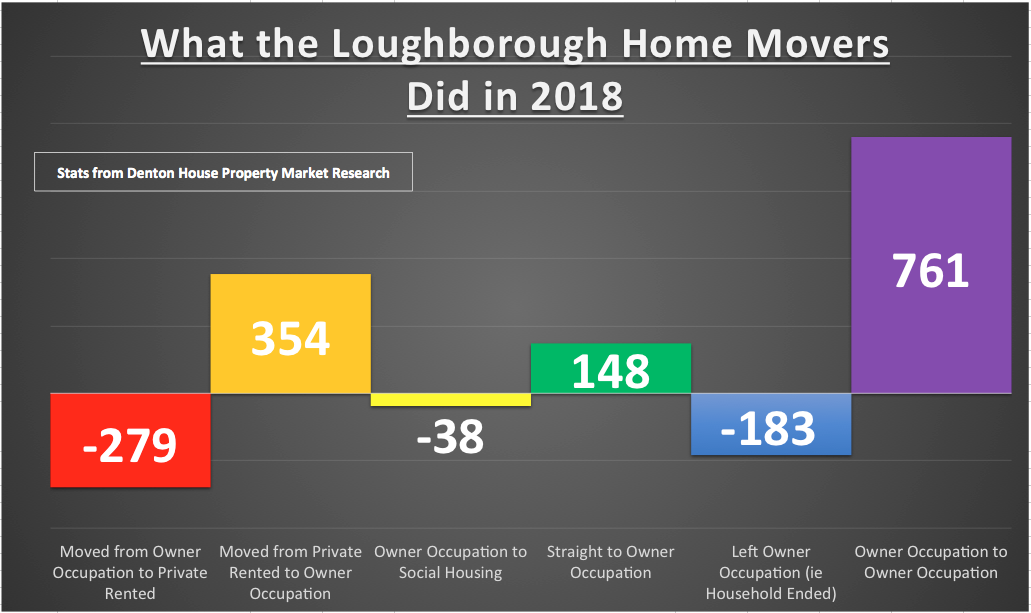 In Loughborough, in the homeowner sector in 2018 i.e owner occupation, 761 households moved within the tenure (sold the home they owned and bought another one) and 148 new households were created (they moved from living with family or friends and bought their first home without privately renting).