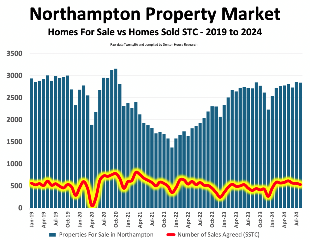 Since January 2024, the number of Northampton homes selling has been at an average of 555 homes sales per month, yet here is a fly in the ointment: the number of homes for sale has steadily risen to 2,837 in August 2024 alone.