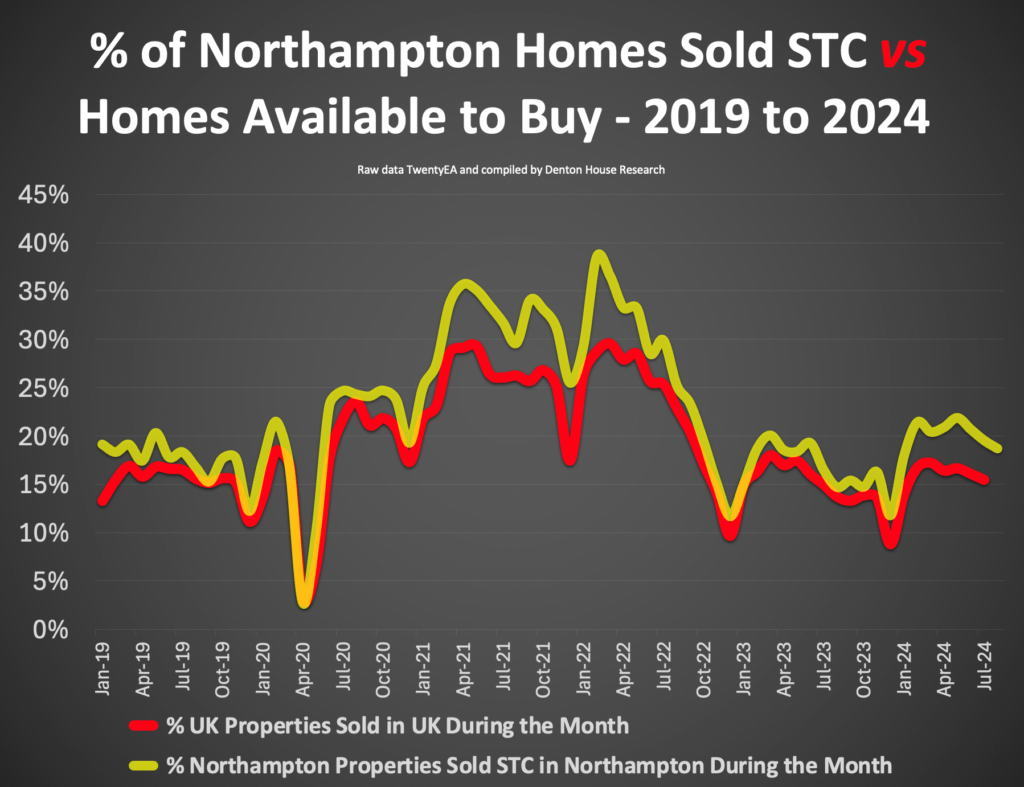 The yellow line on the graph represents the percentage of Northampton properties sold SSTC during the month as a proportion of the homes for sale, while the red line for interest shows the equivalent figure for the entire UK.