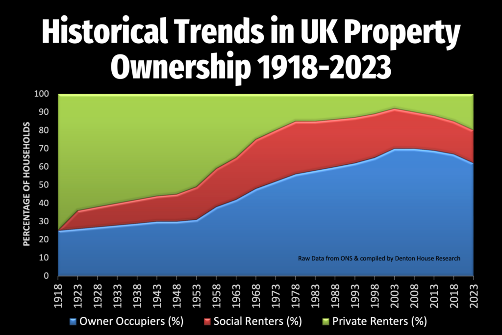In summary, the UK property market has evolved significantly over the past century. The initial dominance of private renting has given way to an increase in homeownership, although recent years have seen a renewed growth in the private rental market.
