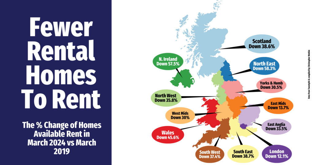 As a Northampton Estate & Lettings agent with a keen eye on the shifting dynamics of the lettings market, it is imperative to highlight the current landscape for both landlords and tenants. Across the UK, the figures are telling: available rental homes on the market have seen a notable decrease from March 2019 to March 2024, with all 12 regions reflecting this trend.
