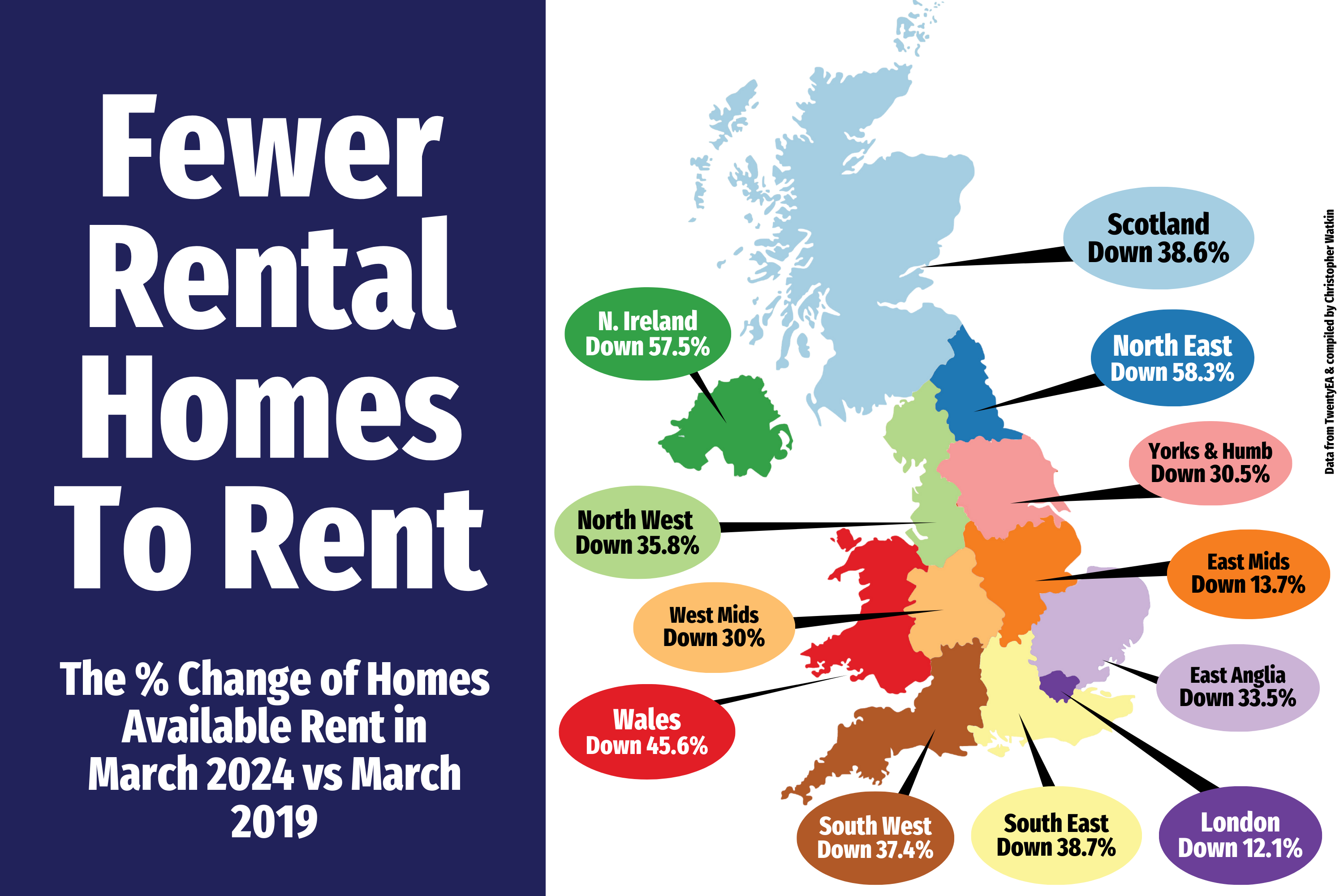 The North East has been hit the hardest, with a reduction of 58.3% in rental properties coming onto the market. As one expects, the areas close the Capital (the South East and East Anglia) have been hit hard, yet London has only seen a slight drop these numbers at 12.1%.