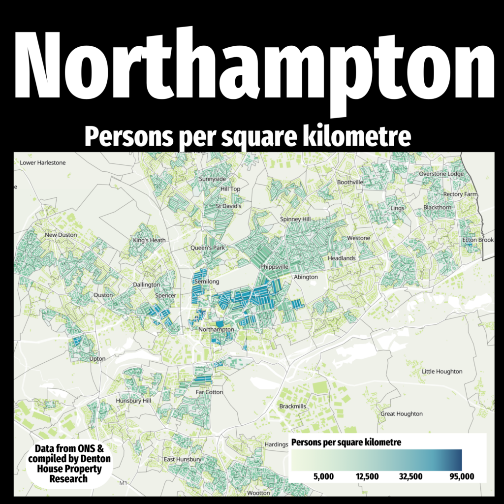 The map above shows population density across Northampton, and what’s clear is that, compared to many other towns and cities, we’re far from crammed in. The light green areas show where population density is low, light blue has medium population density and the dark blues high population density, where more people live per square kilometre. As you can see in the map, Northampton has nothing extreme and mostly green with pockets of light blue. There are areas in the UK with the dark blue areas and they tend be in central London and few other larger cities in the UK.