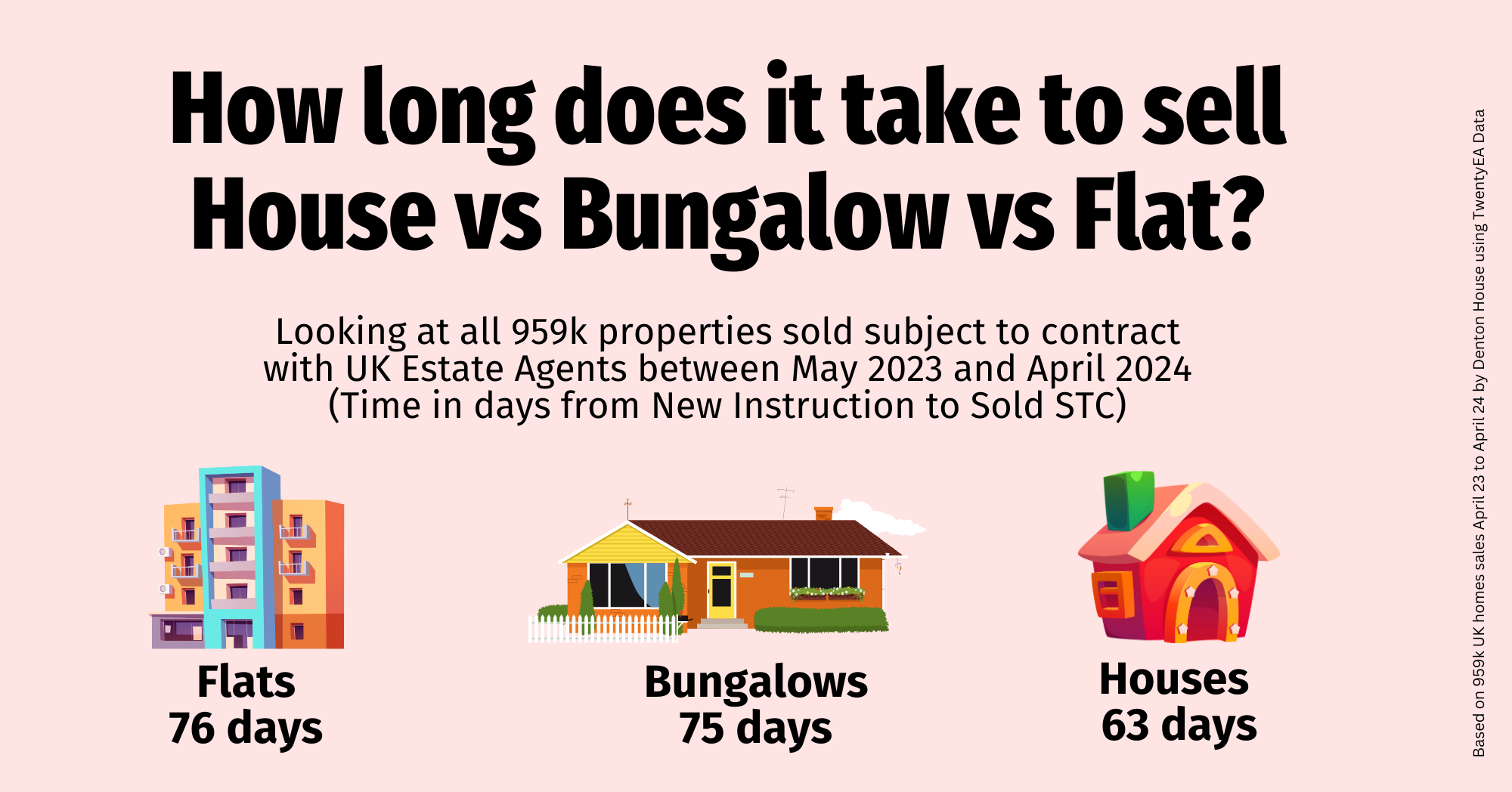 As a homeowner in Northampton, staying informed about national property market trends can provide valuable context for your local decisions. Recent data from Denton House Research, covering the period from May 2023 to April 2024, shows that on average, it took 76 days to sell a flat, 75 days to sell a bungalow, and 63 days to sell a house.