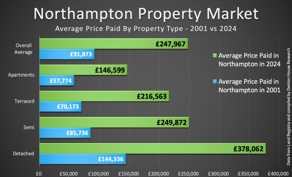 - Overall Average For All Homes in Northampton. The average price of all homes in Northampton in 2001 was £91,873. Now it’s 2024, and it has risen to £247,967. This is a total profit of £156,094 (which is £6,787 profit per year per home or an annual growth of 7.5% per year).