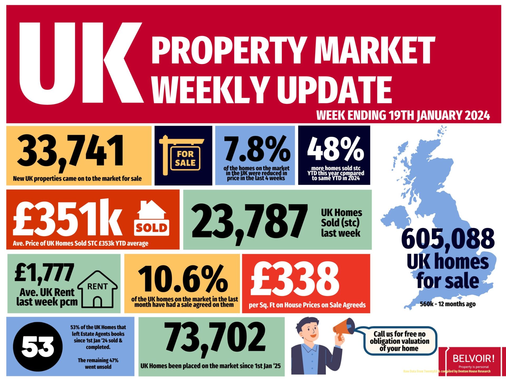 Listings (New properties coming on to the market) – 33.7k UK listings this week (week 2). 19% higher than wk2 in 2024 YTD. 18% higher YTD than 17/18/19 YTD