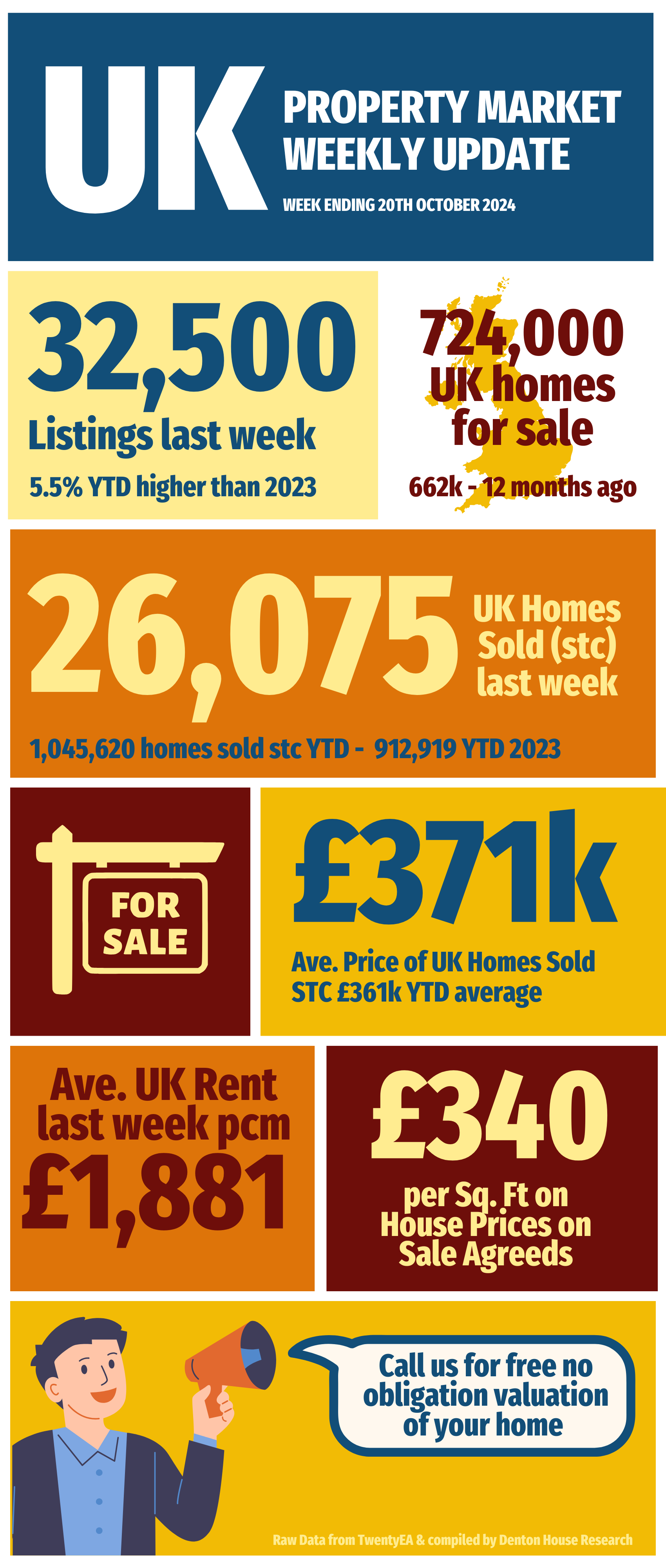 - 26,075 UK homes sold STC (subject to contract) in just one week, bringing this year’s total to 1,045,620 – up from 912,919 last year YTD.