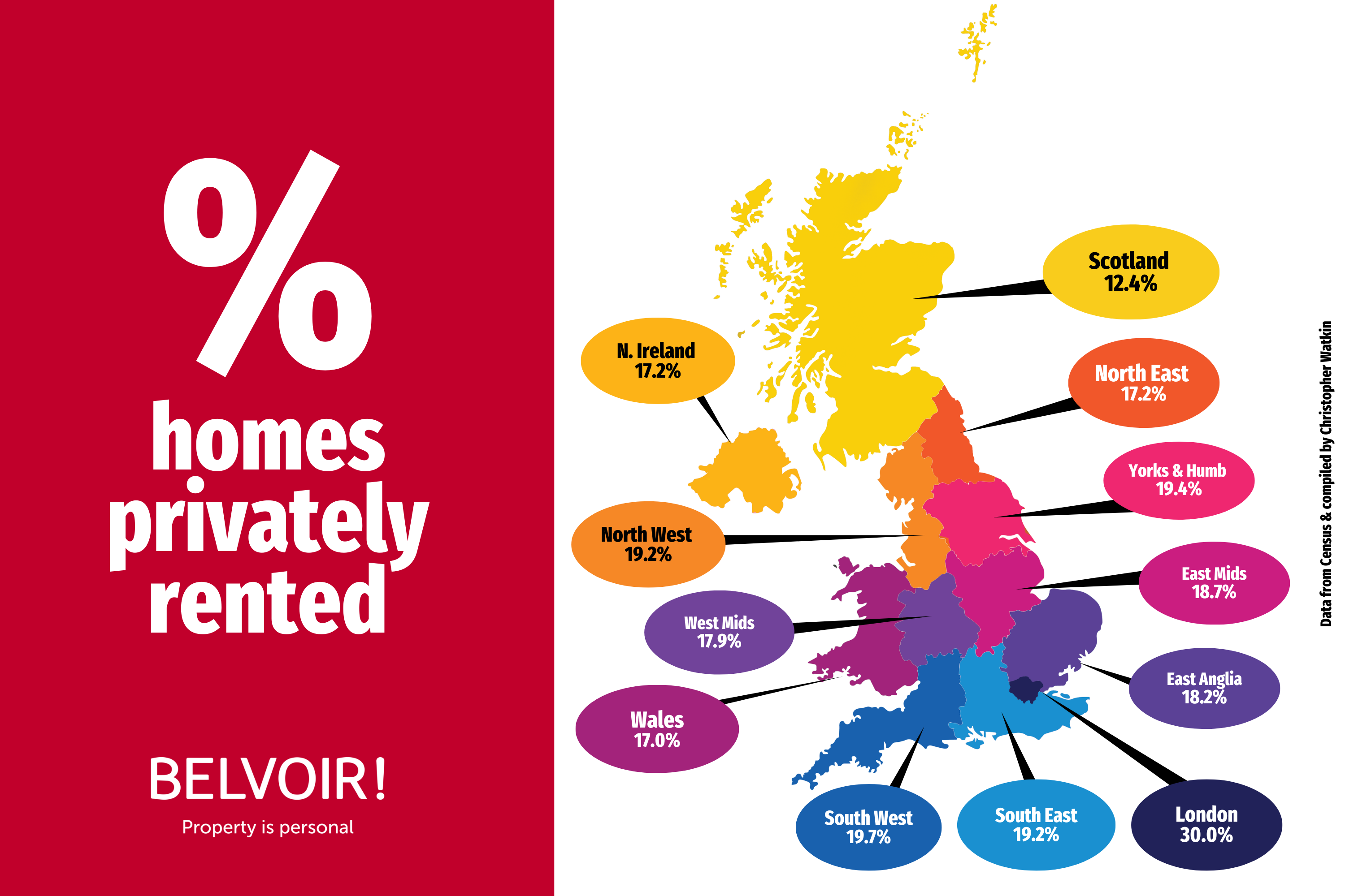 London continues to lead with the highest percentage of privately rented homes at 30%, indicating the strength of the rental market in the capital. The South West, Yorkshire & Humber, the South East and the North West are above the national average of 19%, reflecting regional demand and supply, together highlighting any investment opportunities for landlords seeking to expand their portfolios?