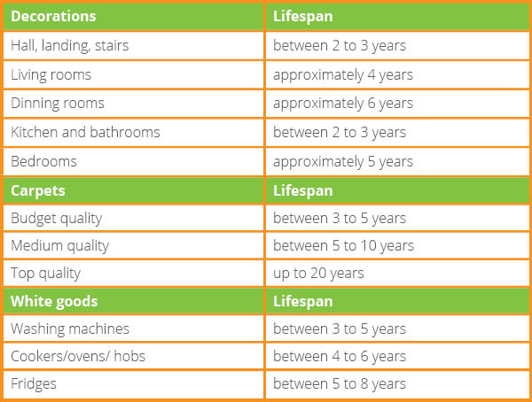 - Expected lifespan of the item. The deposit protection service has a handy table of average expected life spans for various items