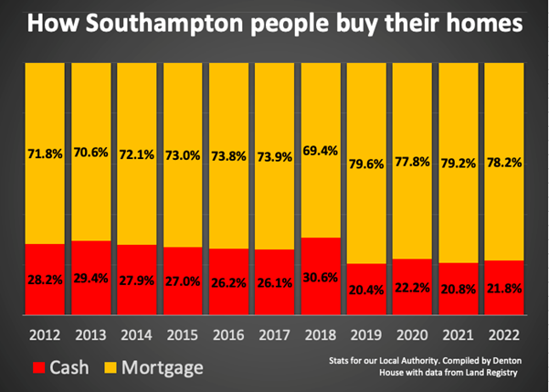 24,690 of the 33,338 property sales in the last decade in Southampton were purchased with a mortgage.