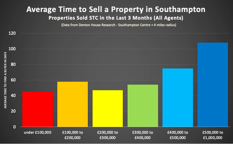 Reflecting on this independent research—which focuses exclusively on Southampton—it’s fascinating to observe how these different price segments (or micro-markets) are currently performing when we look at the average time it takes to secure a buyer in the Southampton area. The average time to find a buyer in the last 3 months in Southampton for those properties that have agreed a sale on them is as follows …
