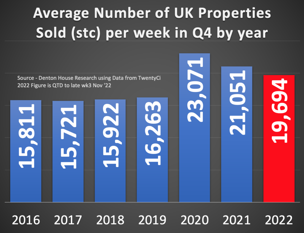 In Q4 2020 (Q4 being October, November and December combined), an average of 23,071 properties were sold per week in the UK (sold – as in a sale was agreed and the property went from available to sold subject to contract (STC)).