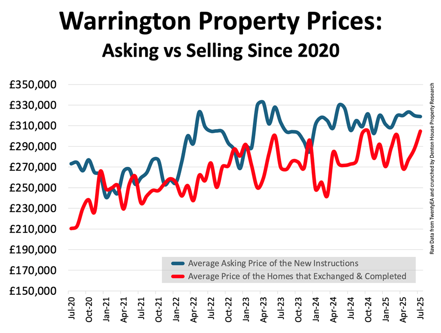 Since the summer of 2020, we’ve been tracking two key numbers: the average asking price of homes coming to market in Warrington, and the average sale price of homes that exchanged and completed. The results are striking and eye-opening.